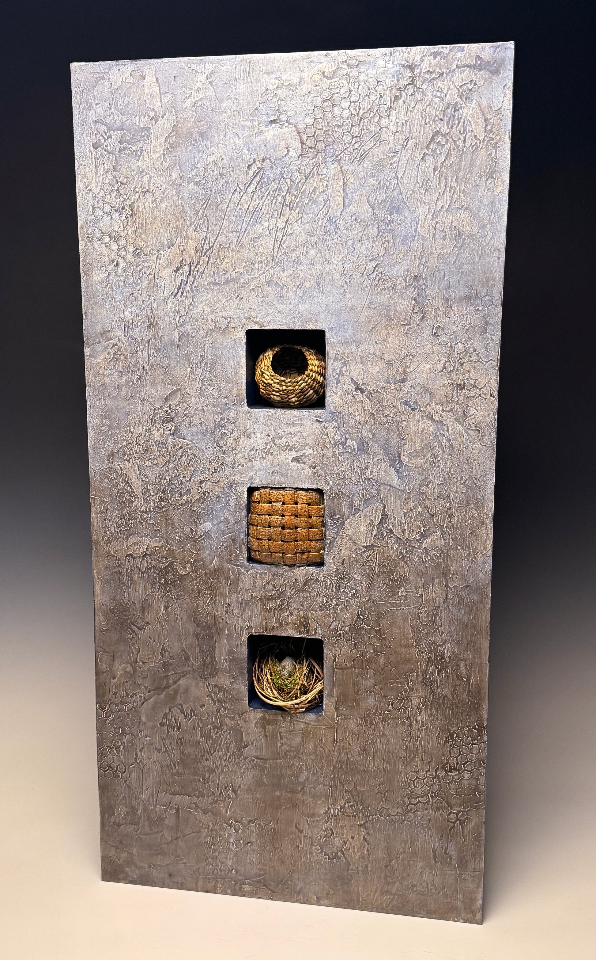 Kudzu, poplar bark, iris foliage, paperclay, mimosa bark, encaustic wax, cold wax, oil paint, poplar