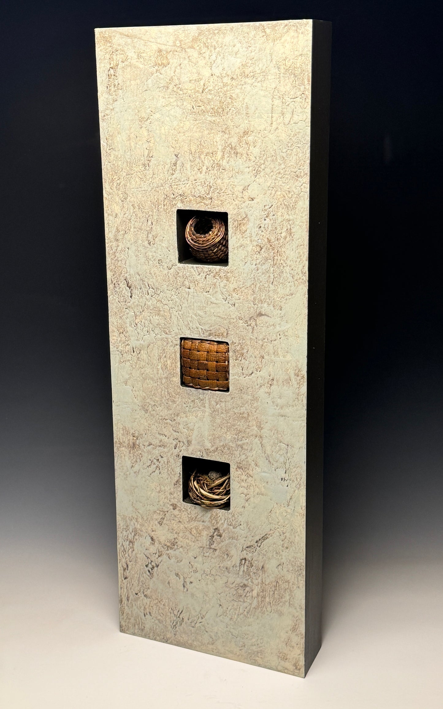 Kudzu, poplar bark, copper wire, mimosa bark, encaustic, cold wax, oil paint, poplar and birch