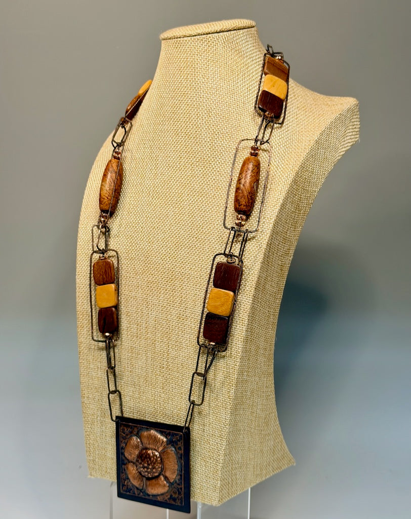 ARTS AND CRAFTS INSPIRED REPOUSSE/CHASING COPPER FLOWER MEDALLION NECKLACE JH155