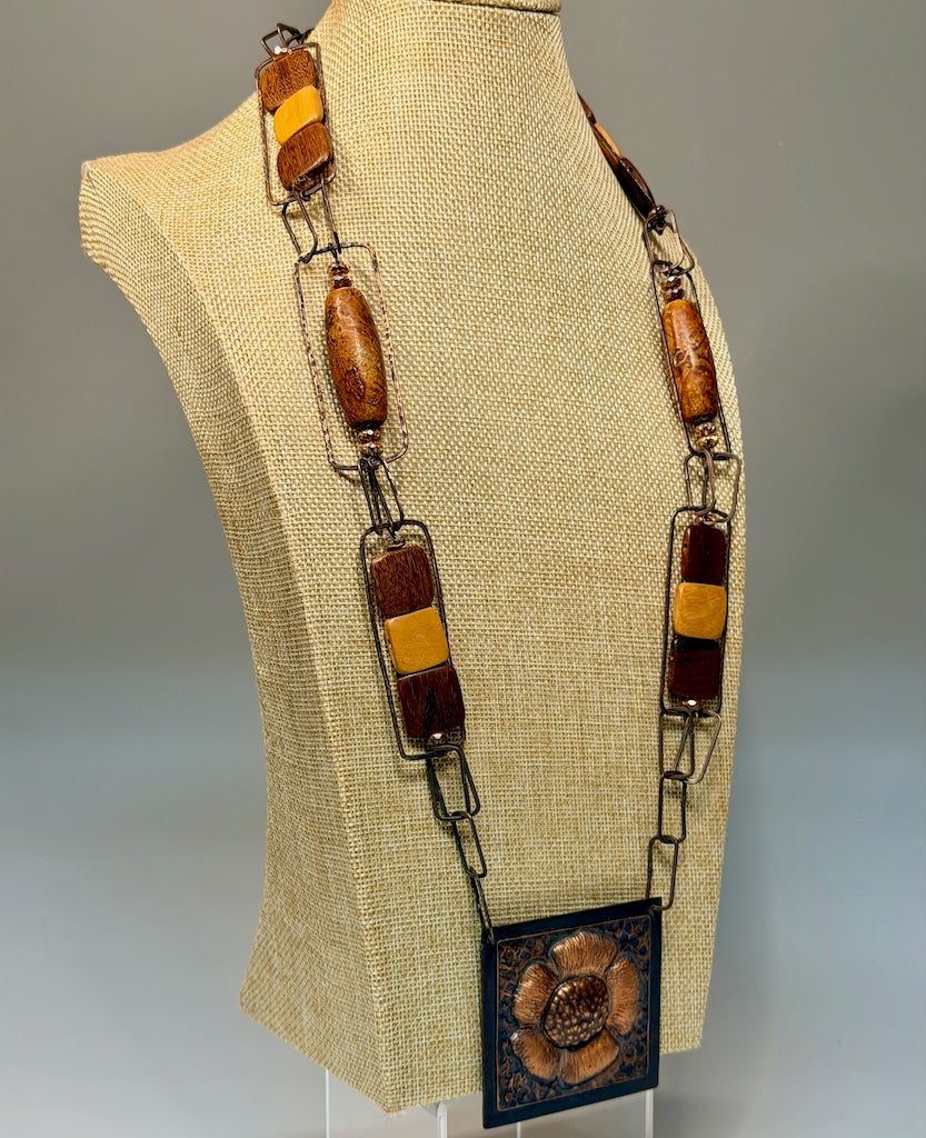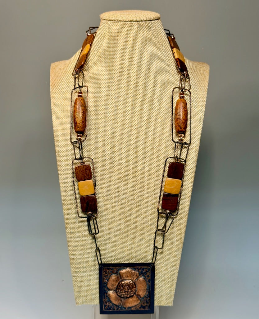 Hmmered copper links, square wooden beads, transparent copper coated washer beads, Tibetan gemstone barrel tube beads.