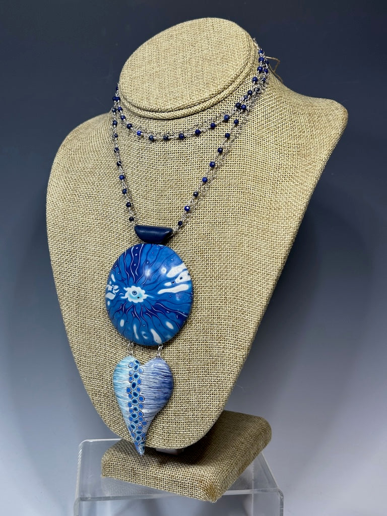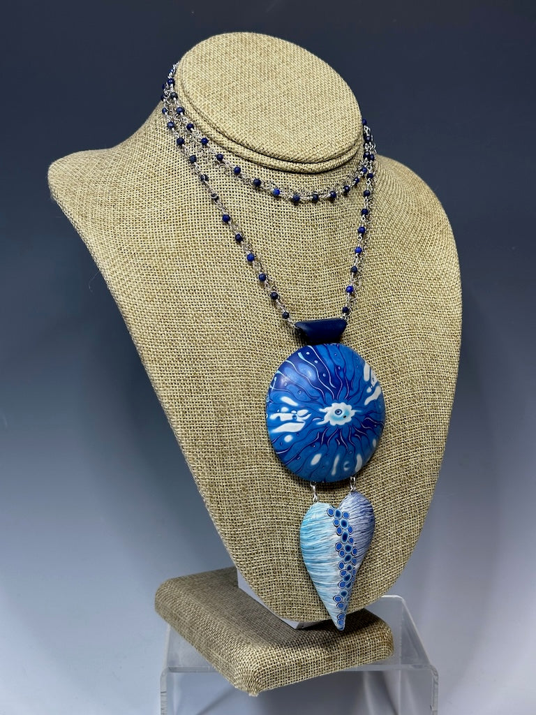 SUMMER BLUES LARGE HOLLOW BEAD PENDANT ON LAPIS AND SILVER ROSARY CHAIN DKPCN735