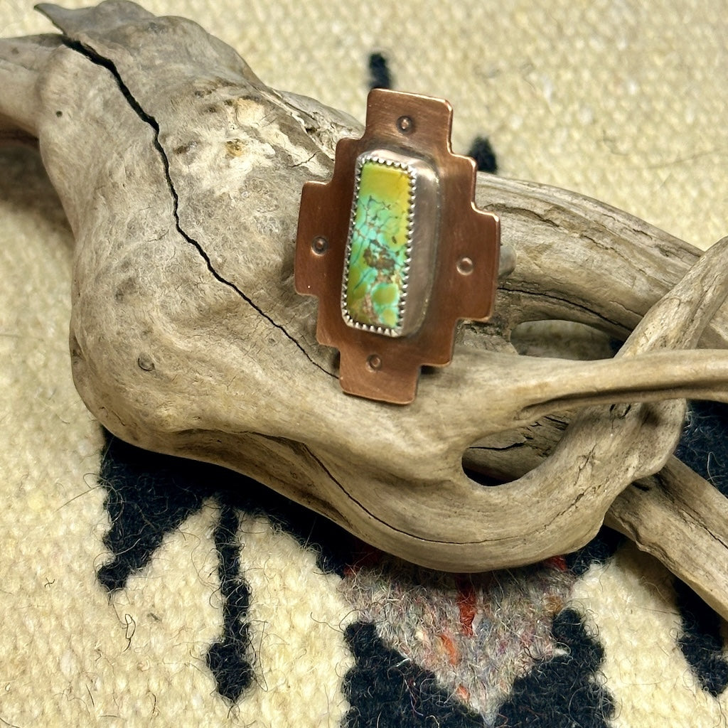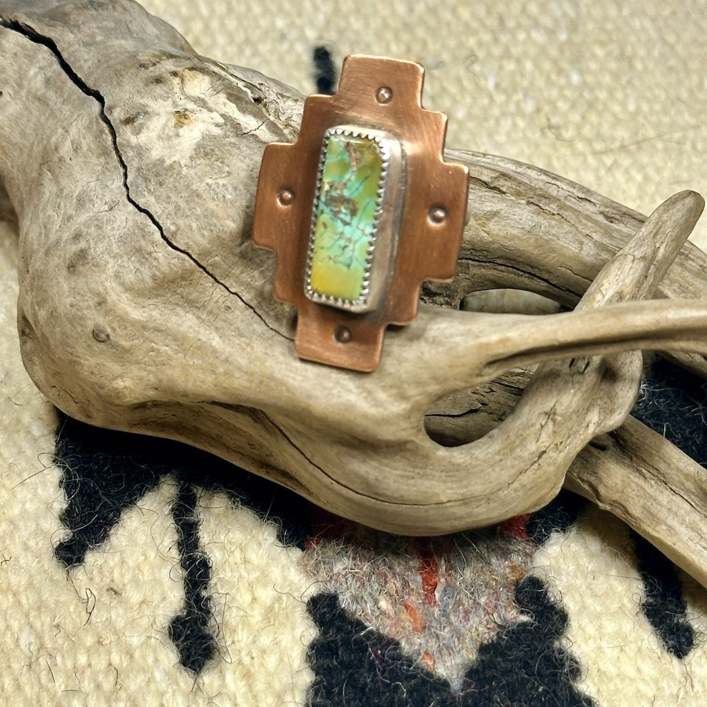 Turquoise Mountain mined in Arizona. Set in serrated sterling silver on copper. Hand stamped Native sun. Sterling silver ring shank. Antiqued and brushed.