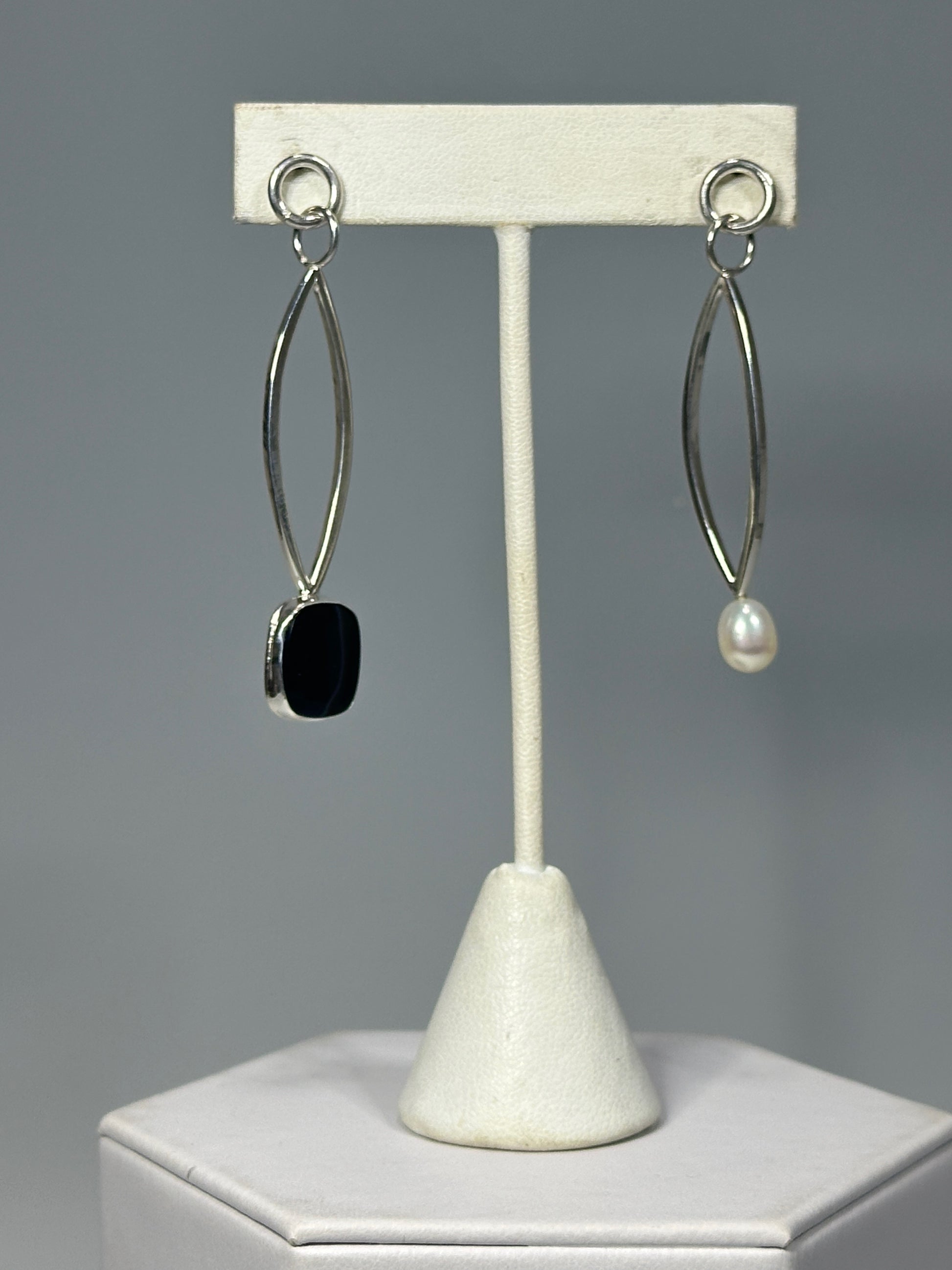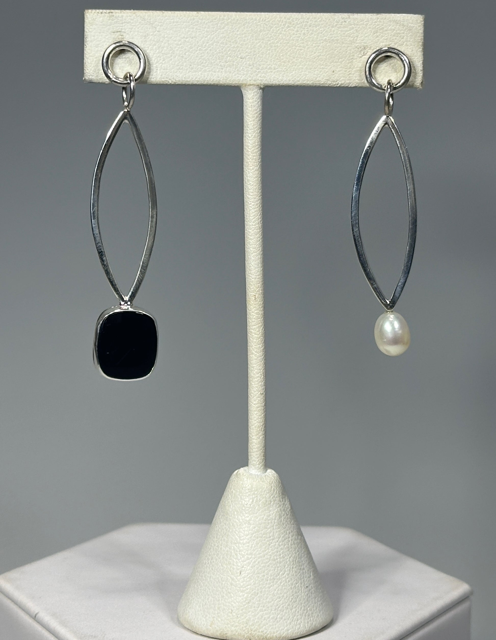 ASYMMETRICAL STUD DANGLE EARRINGS WITH PEARL AND BLACK ONYX MB192E
