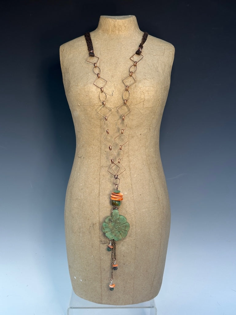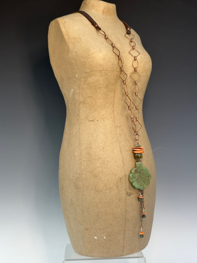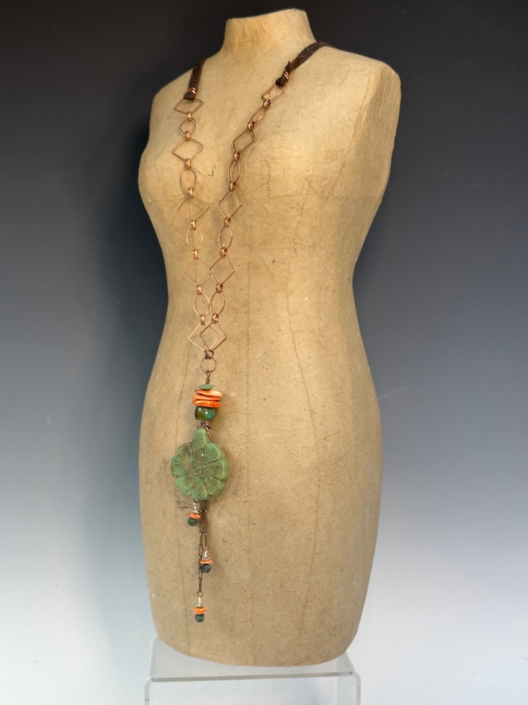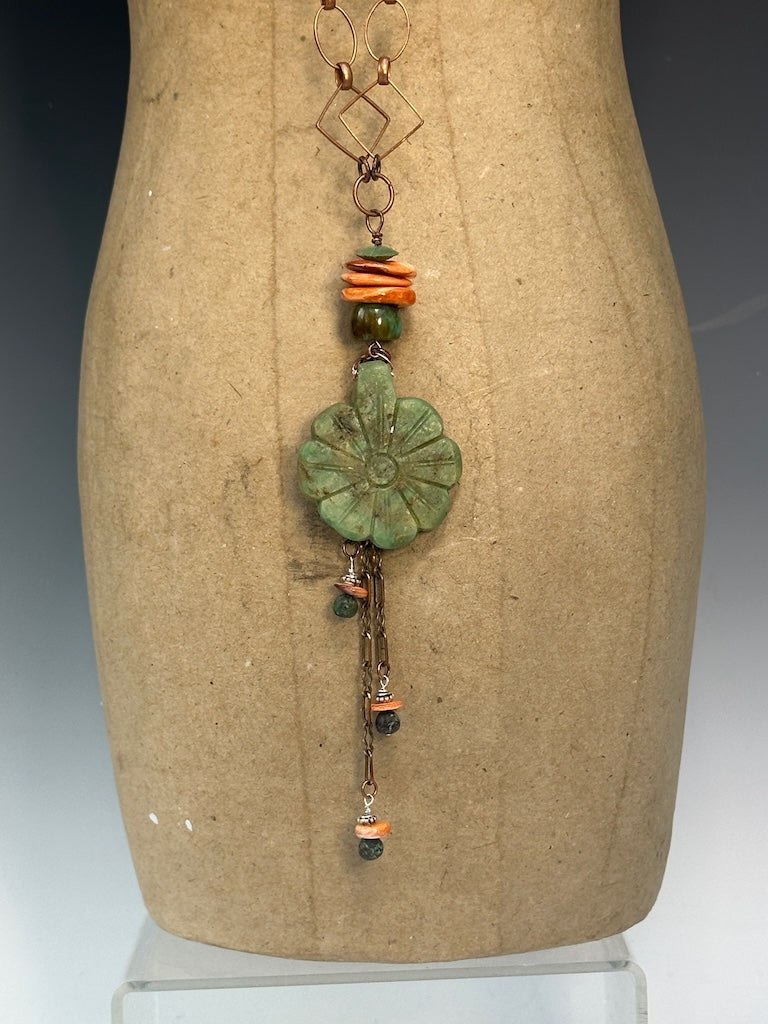 SPINY OYSTER, TURQUOISE AND CARVED STONE FOCAL PENDANT WITH ADJUSTABLE LEATHER AND COPPER NECKLACE LCN930