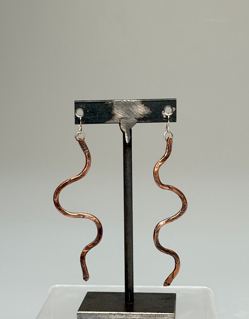 Hand forged and hand stamped copper rattlesnakes that are meant for protection and renewal. Antiqued, brushed, and polished.