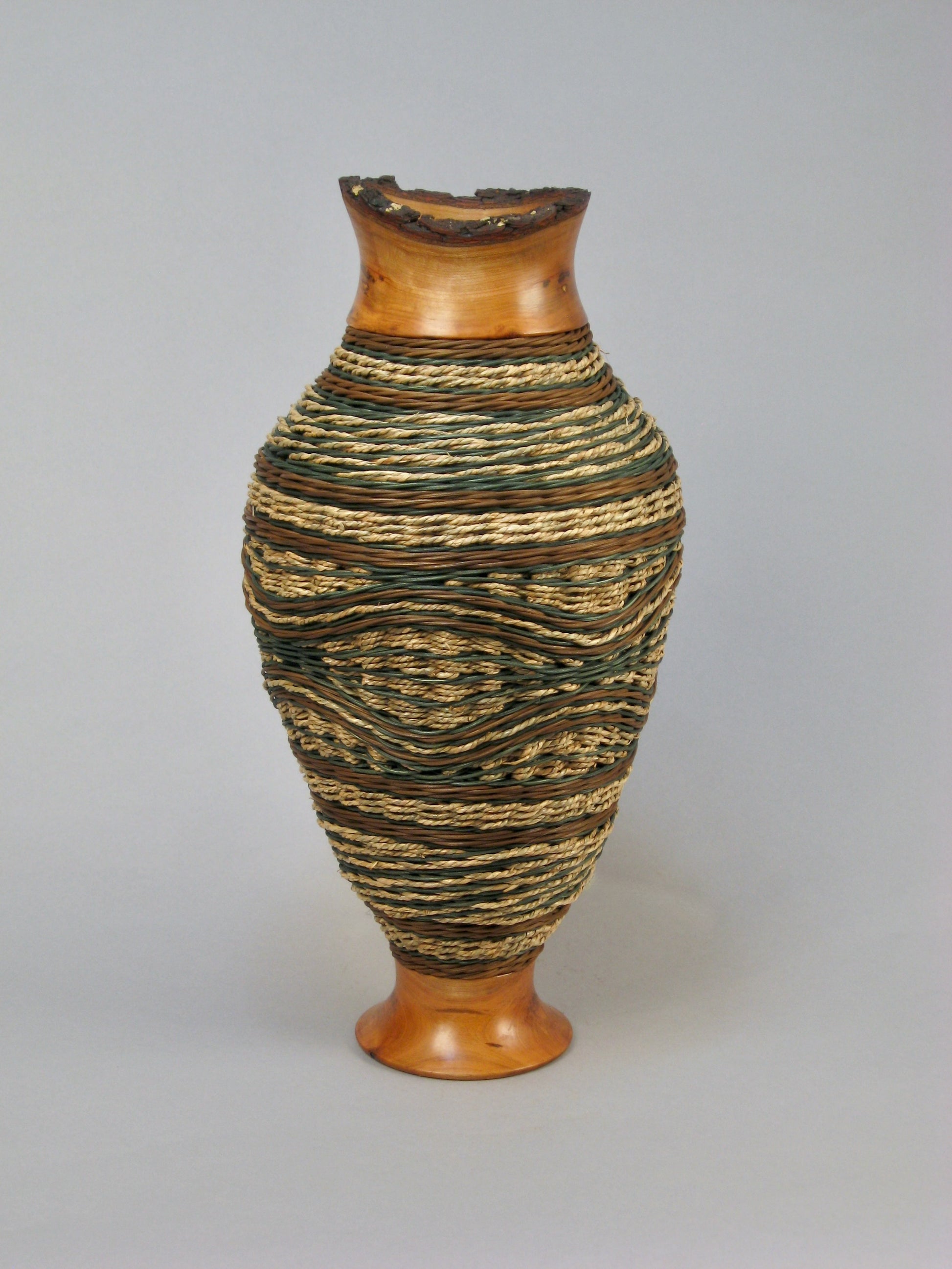 The work is wicker-weave basketry of dyed rattan and seagrass cord, and lathe turned wood bases, rings and rims. Each piece is a one-of-a-kind handmade original. Even when I make a second piece with the same construction, they are never quite alike. Especially, the wooden elements have all the variety that nature provides.
