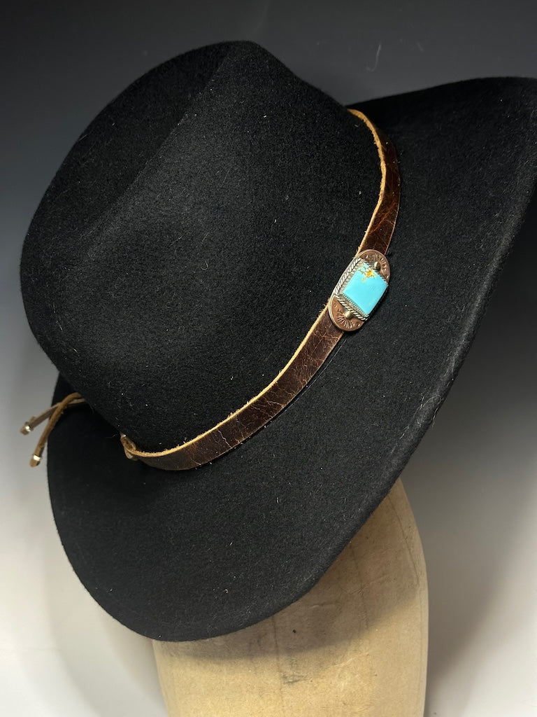 Kingman turquoise from Arizona. Set in sterling silver with rope detail and brass bead accents. Hand stamped copper Native sun design. Elk leather. Adjustable